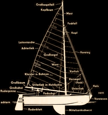 Da bei dem Boot allerdings weder Rigg noch Segel vorhanden waren, machte ich mich nach längerem Studium einschlägiger Webseiten daran, einen Mast zu bauen und ein Segel zu nähen. Danach kannte ich mich nicht nur mit den vielen Begriffen auf dem Bild aus, sondern auch mit Segelmaterialien, Trimmtechniken und lauter solchen Sachen.